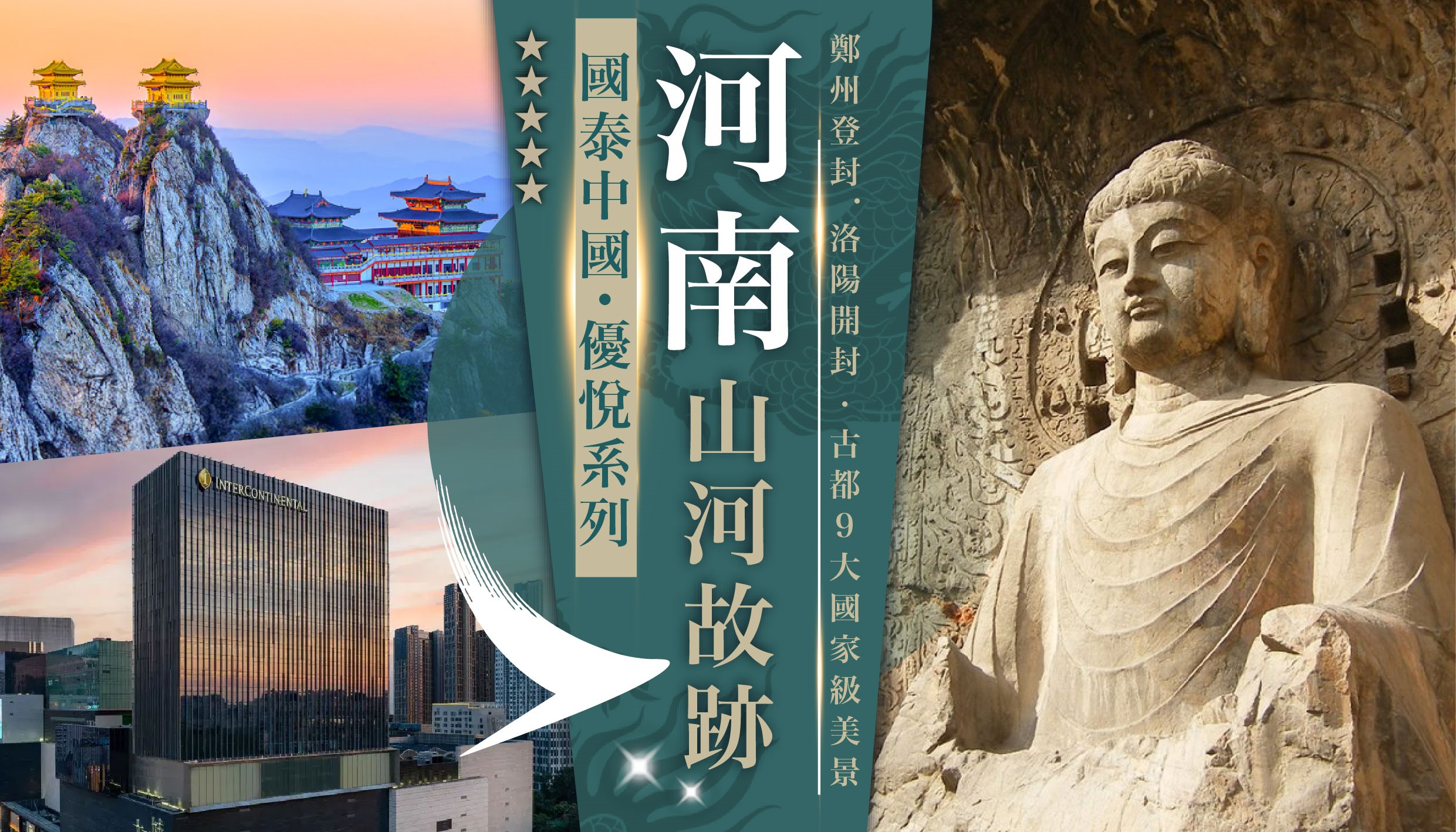 [8天] [河南優悅] 鄭州登封.洛陽開封.2大世產 [龍門石窟+少林寺].國泰航空.古都9大國家級美景.道教聖地 [老君山+追夢谷].清明上河園.中國十大名寺 [相國寺].黑珍珠美饌 [遠洋私廚].武皇盛宴半水席.4晚國際5星 [絕無指定購物站]