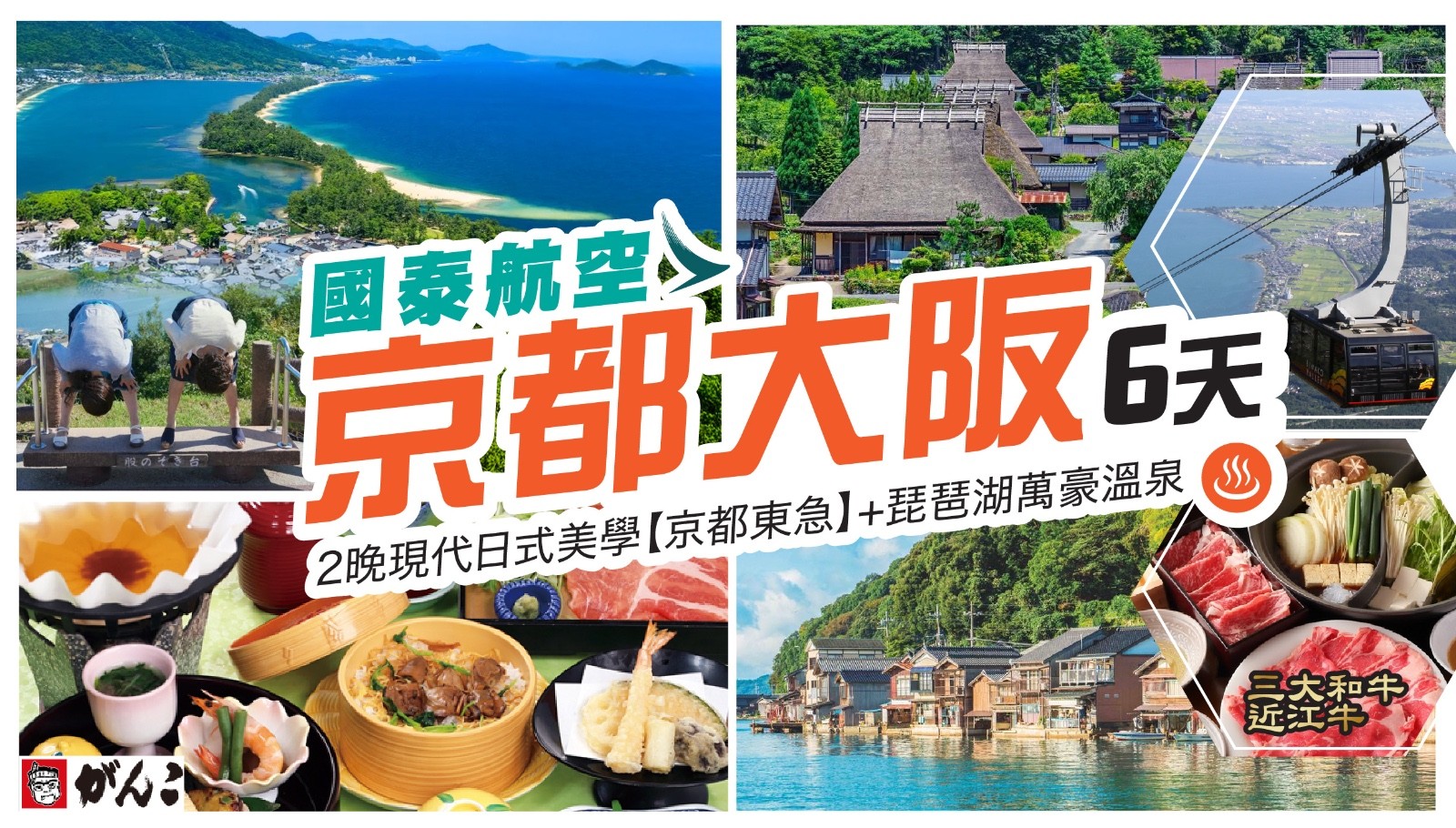 [6天] [漫遊京都] 國泰大阪.2晚現代日式美學 [京都東急].三大名所 [三景天橋立+米芝蓮二星伊根舟屋+童話美山合掌村].絕景TERRACE湖+纜車.LA COLLINA甜點王國.三大和牛🐮近江牛料理.頑固料理鍋御膳.琵琶湖萬豪溫泉⚡[第二位50%OFF.月曆顯示第二位價]