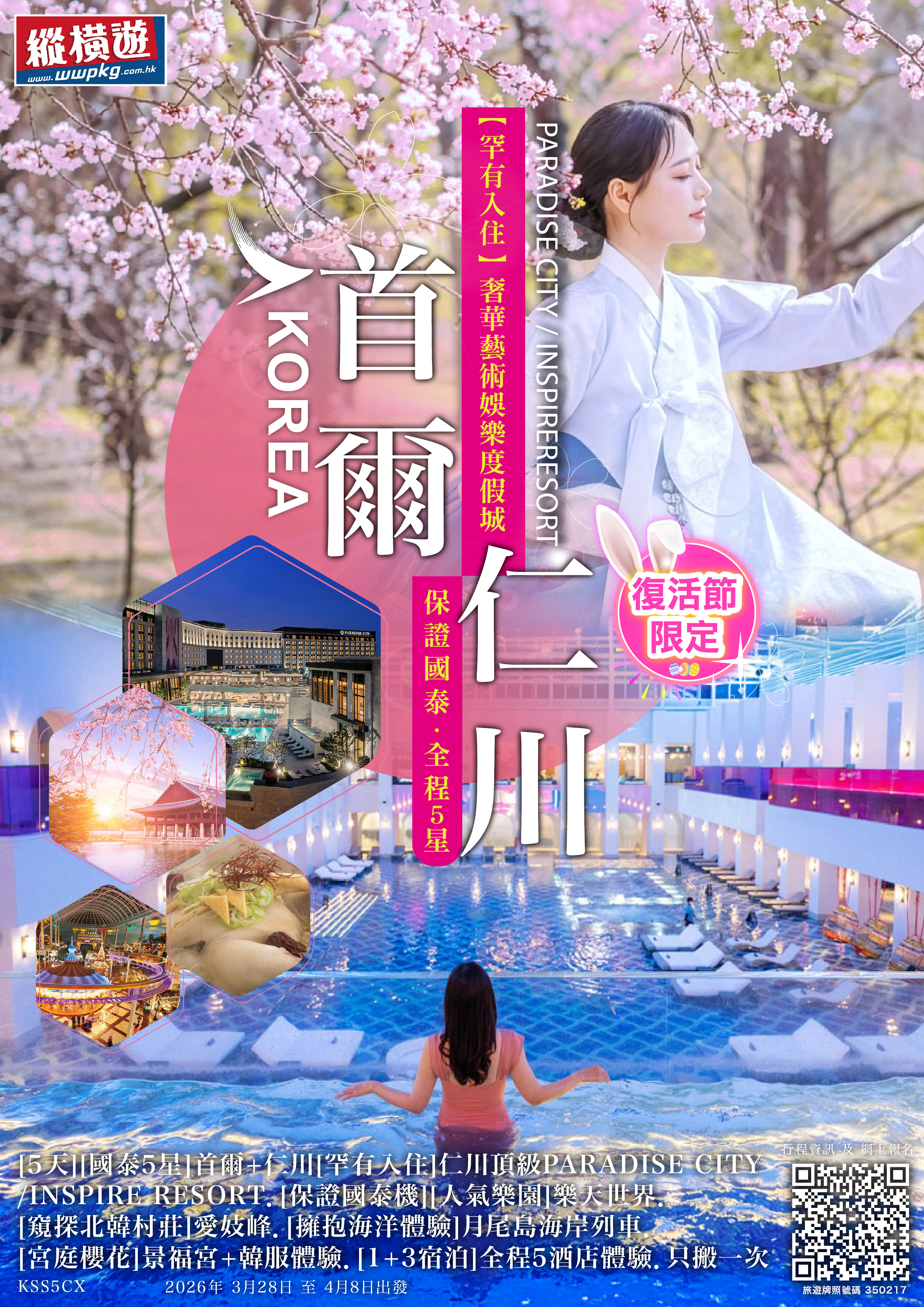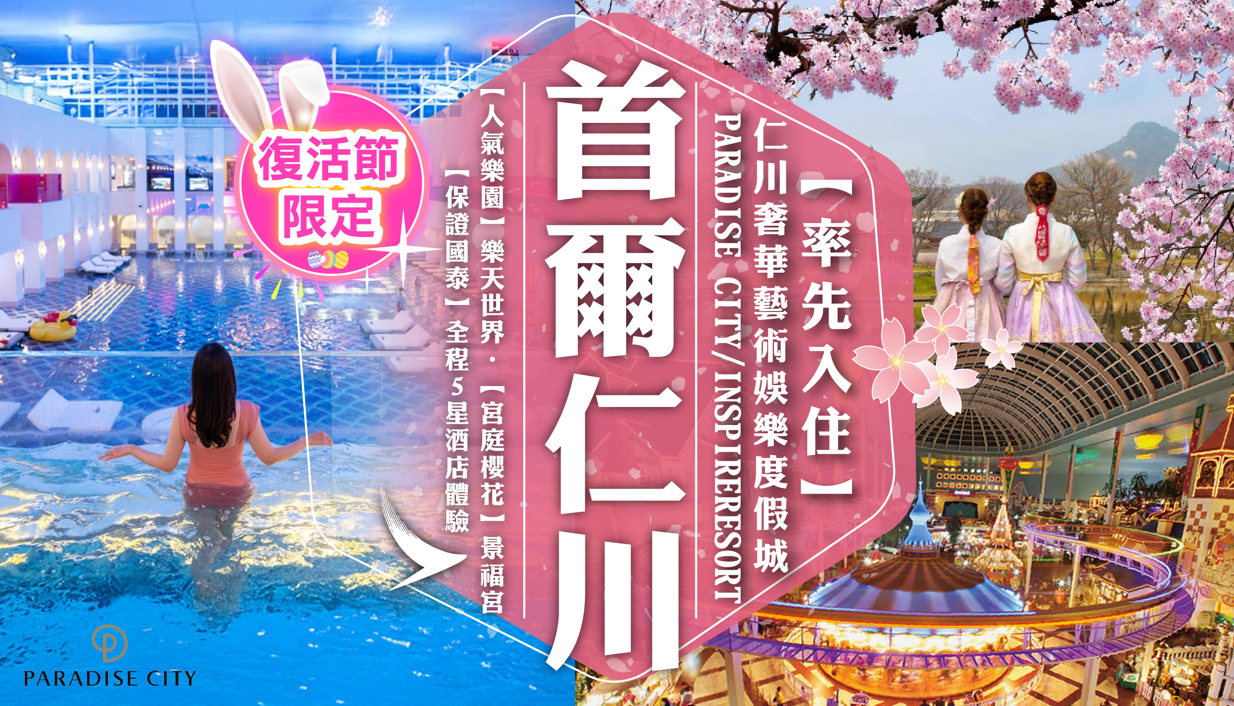[5天] [國泰5星] 首爾+仁川 [罕有入住]仁川頂級PARADISE CITY / INSPIRE RESORT.[人氣樂園] 樂天世界.[窺探北韓村莊] 愛妓峰.[擁抱海洋體驗] 月尾島海岸列車.[宮庭櫻花] 景福宮+韓服體驗.[1+3宿泊] 全程5酒店體驗.只搬一次