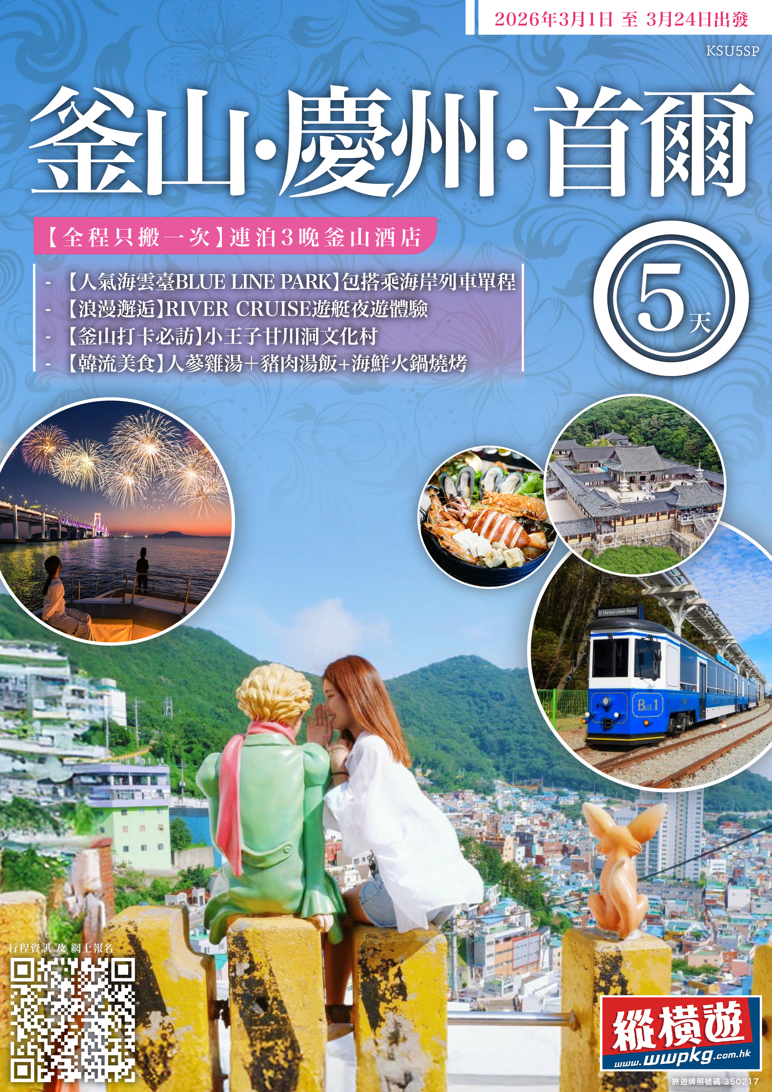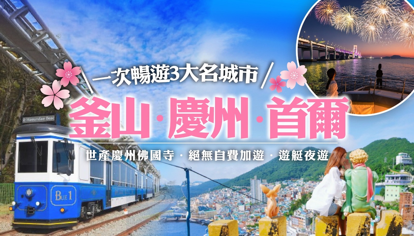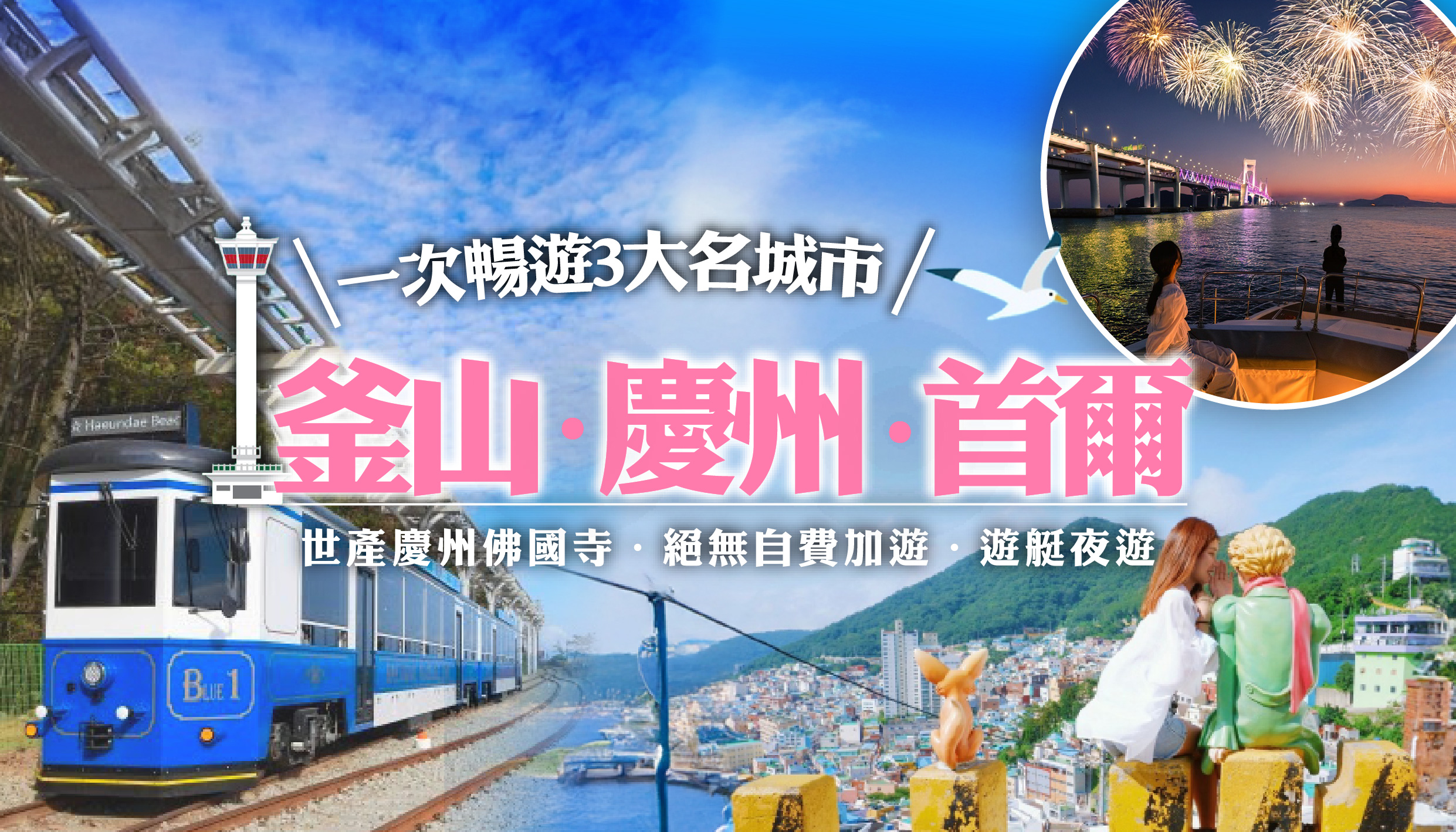[5天] [魅力釜慶] 釜山+慶州+首爾.世產慶州佛國寺.海濱列車BLUE LINE PARK.[無邊際海景] 青沙浦踏石SKY WALK+最美鐵道+紅白燈塔.[遊艇夜遊] RIVER CRUISE.[小王子] 甘川洞文化村.海鮮火鍋+燒烤.3晚型格GNB 酒店 [只搬一次] [絕無自費加遊]