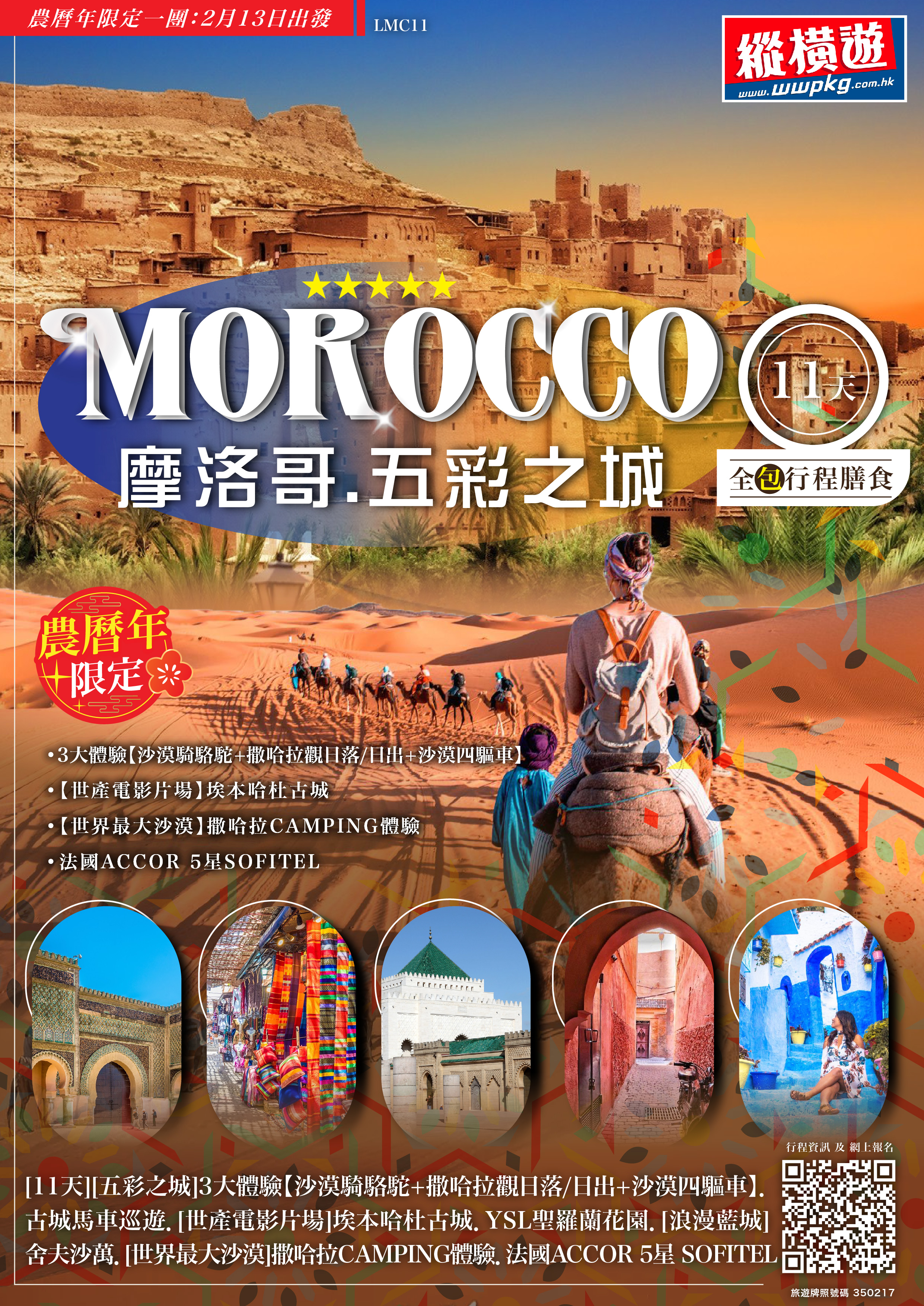 [11天] [農曆年限定] [五彩之城] 摩洛哥.3大人氣體驗「沙漠四驅車 +沙漠騎駱駝+撒哈拉觀日落」.古城馬車巡遊.[世產電影片場] 埃本哈杜古城.YSL聖羅蘭花園‧[浪漫藍城]舍夫沙萬.世界最大沙漠]撒哈拉CAMPING體驗.北非諜影RICK’S CAFÉ.提升3晚國際5星 [全包行程]