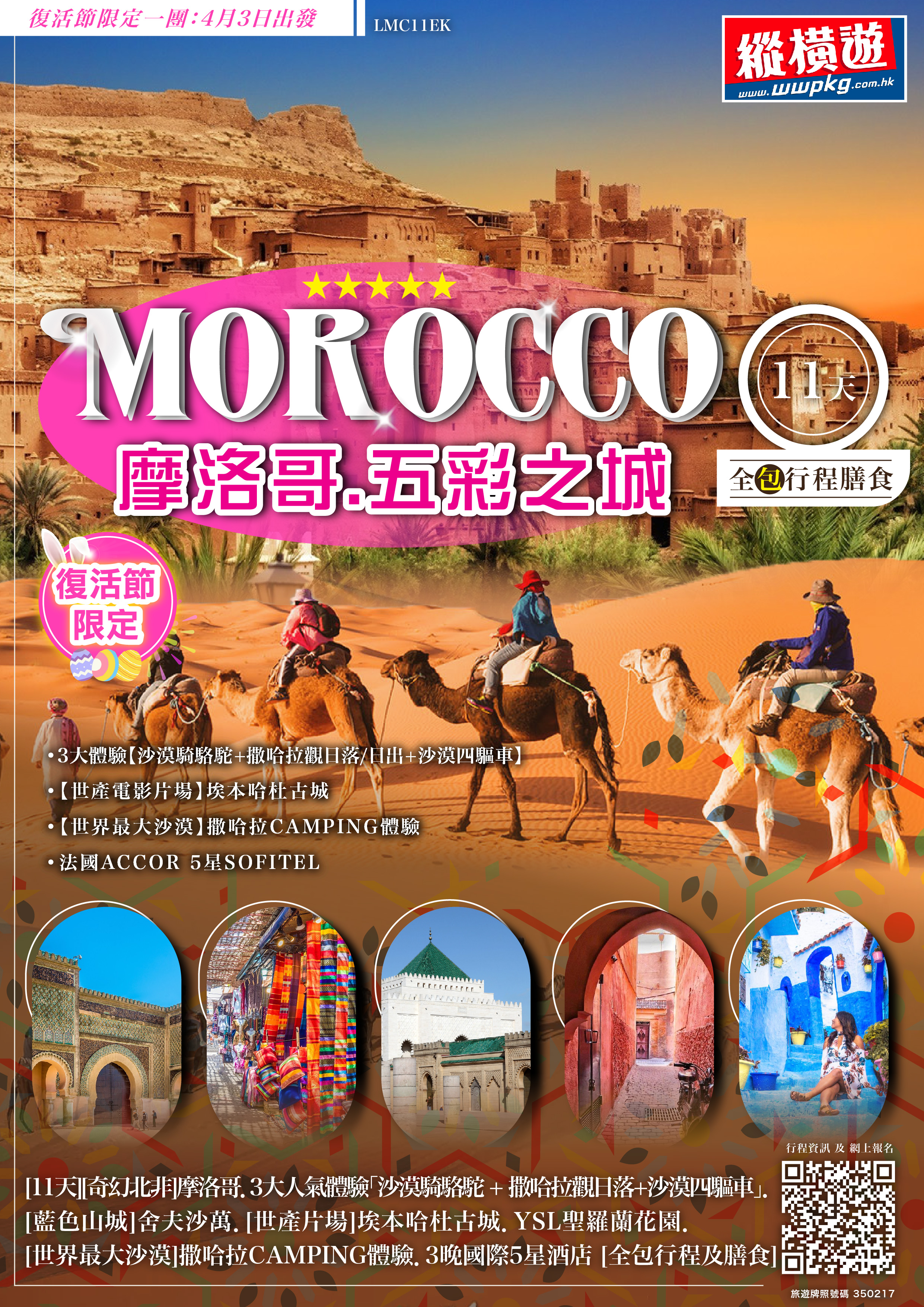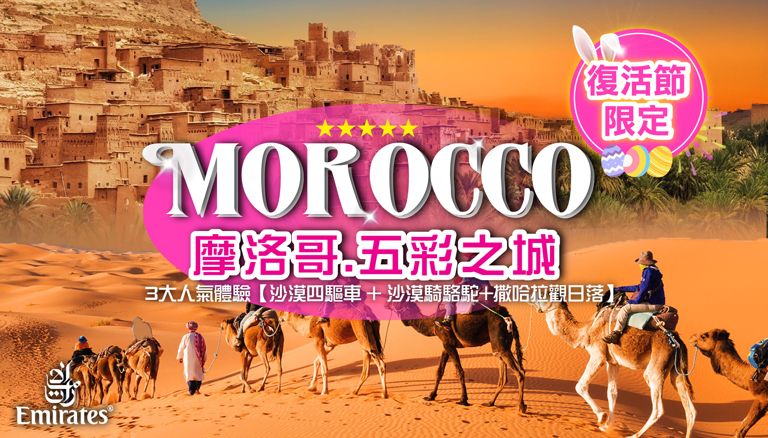 [11天] [奇幻北非] 摩洛哥.3大人氣體驗「沙漠騎駱駝 + 撒哈拉觀日落+沙漠四驅車」.[藍色山城]舍夫沙萬.[世產片場] 埃本哈杜古城.YSL聖羅蘭花園.[世界最大沙漠]撒哈拉CAMPING體驗.3晚國際5星酒店 [全包行程及膳食]