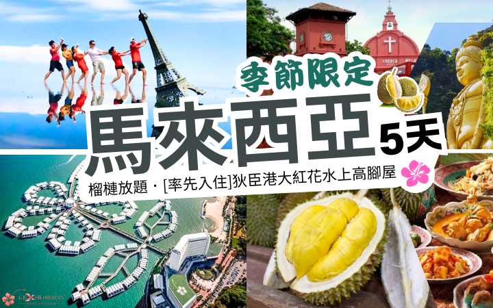 [5天] [季節限定] 吉隆坡+狄臣港+馬六甲 [榴槤盛宴] 任食榴槤放題.[度假天堂狄臣港] LEXIS HIBISCUS 私人泳池水中高腳屋.[隱世秘境] 天空之鏡SKY MIRROR.[世產] 馬六甲古城¦連泊3晚吉隆坡4星.只搬一次✈️早鳥優惠碼AP2024⚡️最高減$300
